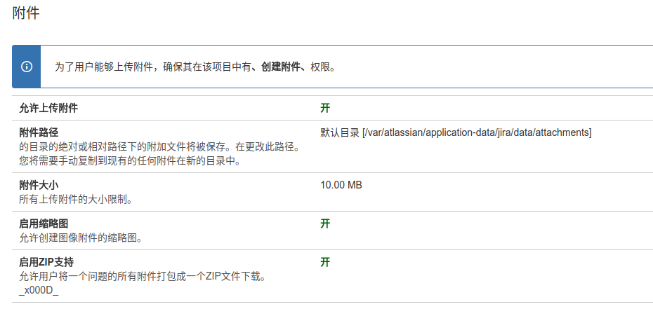 注意:这里的备份数据不包括附件。Jira附件都保存到服务器的/var/atlassian/application-data/jira/data/attachments路径下,这里的附件数据需要手动写脚本进行备份。点击右上角的"系统"-"高级"-"附件"就可以看到Jira附件的设置