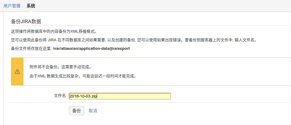 管理员账号登录Jira,点击右上角的"系统"-"导入导出"-"备份系统",Jira默认会打开自动备份的功能,备份路径为/var/atlassian/application-data/jira/export;入如果没有打开,也可以手动进行备份,如下,可以自定义备份的文件名。