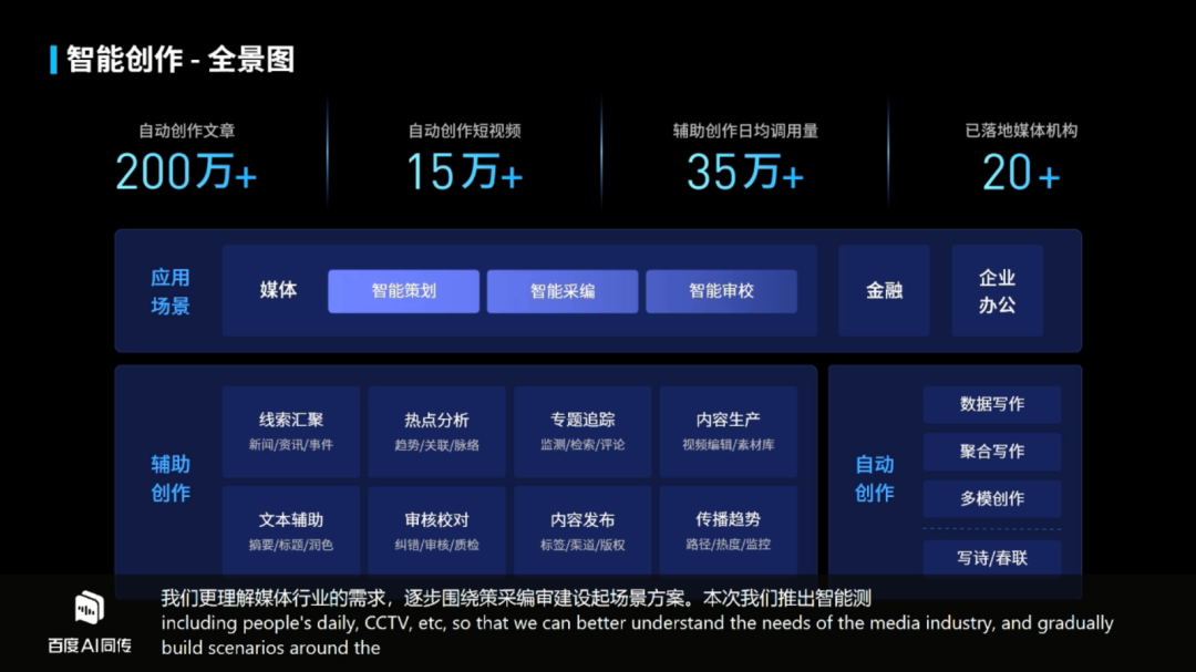 百度智能创作平台上线至今,已经自动创作了200多万篇文章、超过15万条短视频、辅助创作的日均调用量超过35万,累计落地20多家机构媒体。同时围绕策、采、编、审的媒体工作场景,百度推出智能策划、智能采编、智能审校三大场景方案,帮助媒体降低创作成本,提升创作效率。