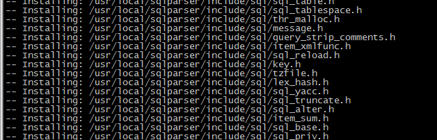 DCMAKE_INSTALL_PREFIX为sqlparser库文件和头文件的安装目录,其中lib目录包含库文件libsqlparser.so,include目录包含所需的所有头文件。