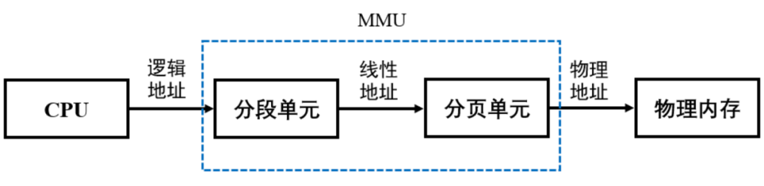 MMU 的工作流程:CPU 生成逻辑地址交给分段单元,分段单元进行处理将逻辑地址转换为线性地址,再线性地址交给分页单元,分页单元根据页表映射转换内存物理地址,其中可能出现缺页中断。