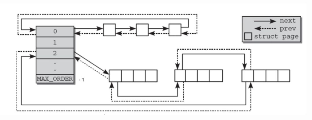 伙伴系统维护了 n=0~10 共 11 个块链表,每个块链表分别包含了大小为 2^n 个连续的物理页。当 n=10 时即 1024 个 4KB 页对应 4MB 大小的连续物理内存块,这里的 n称为 order,在伙伴系统中 order为0~10,也就是最小的是 4KB,最大的内存块是4MB,这些相同大小的物理块组成双向链表进行管理,如图展示了 order=0 和 order=2 的两个双向链表的情况: