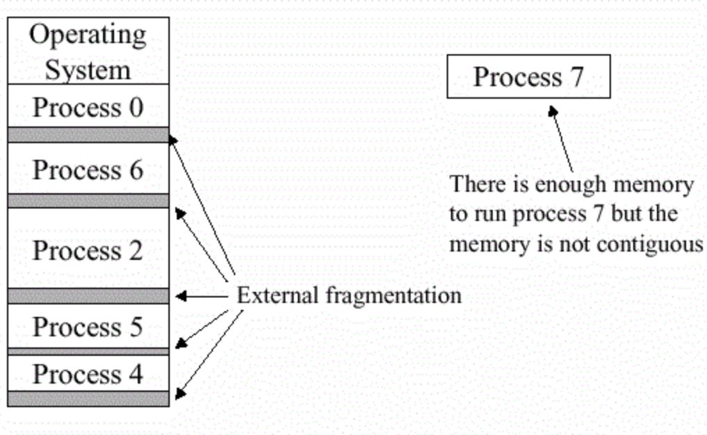 虽然虚拟地址让进程使用的内存在物理内存上是离散的,但是很多时候进程需要一定量连续物理内存,如果大量碎片存在,就会造成无法启动进程的问题,如图Process7需要一块连续的物理内存却无法被分配: