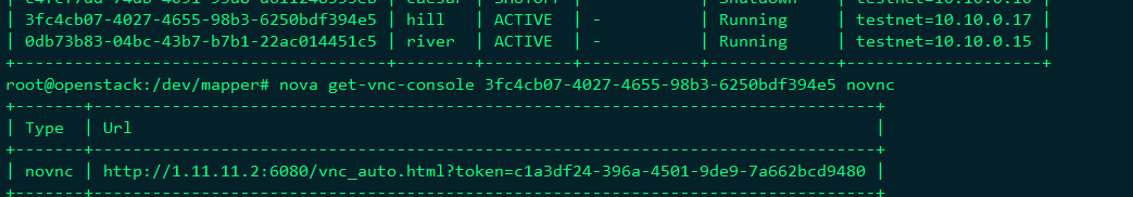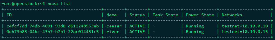 创建虚拟机 nova boot river --image 5808f608-2b30-4b65-8c2f-436b4d2b5734 --nic net-id=ffe7b6bc-1e0f-457f-b09b-8e1c5b74db6c --flavor 1