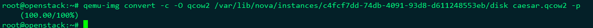 查询出镜像所在位置,执行qemu-img convert -c -O qcow2 /var/lib/nova/instances/c4fcf7dd-74db-4091-93d8-d611248553eb/disk caesar.qcow2 -p 将镜像转化为想要的名称*.qcow2
