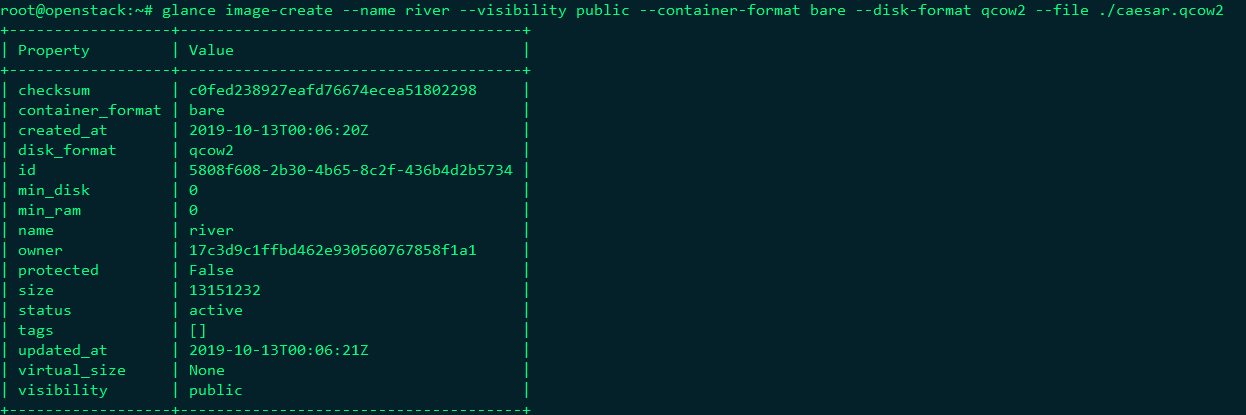 创建镜像 glance image-create --name river --visibility public --container-format bare --disk-format qcow2 --file ./caesar.qcow2