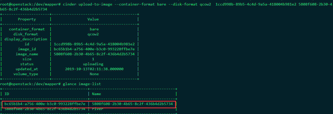 以上是使用本地盘,若使用cinder 卷,需要使用 cinder upload-to-image --container-format bare --disk-format qcow2 <卷id>d40205f9-ecef-491b-90b8-2ce12c6fbb7c <镜像名> cirros 更新镜像,并使用 glance image-download <镜像id> --file <下载位置> 下载此镜像供后续使用。