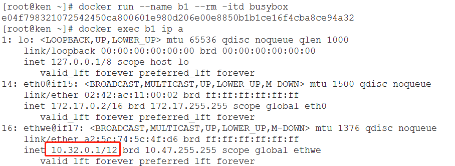 [root@ken ~]# docker run --name b1 --rm -itd busybox