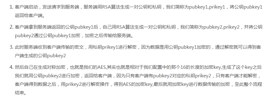 说人话就是前、后端各自生成自己的RSA秘钥对(公钥、私钥),然后交换公钥(后端给前端的是正常的明文公钥,前端给后端的是用后端公钥加密后的密文公钥;PS:其实我觉得直接交换两个明文公钥就行了),后端生成AES的明文key,用明文key进行AES加密得到密文数据,用前端的公钥进行RSA加密得到密文key,API交互时并将密文数据与密文key进行传输,前端用自己的私钥进行RAS解密的到明文key,用明文key进行AES解密得到明文数据;前端给后端发送数据时同理,这样一来,传输的数据都是密文,且只有秘钥才能解密