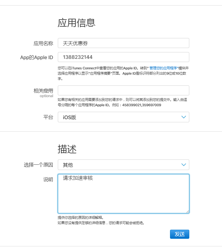 相关应用如果没有关联的不用填,然后填写好加急审核的理由,提交。