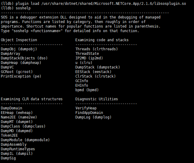 (如果sos加载失败,启动后输入命令:plugin load /usr/share/dotnet/shared/Microsoft.NETCore.App/2.1.6/libsosplugin.so
