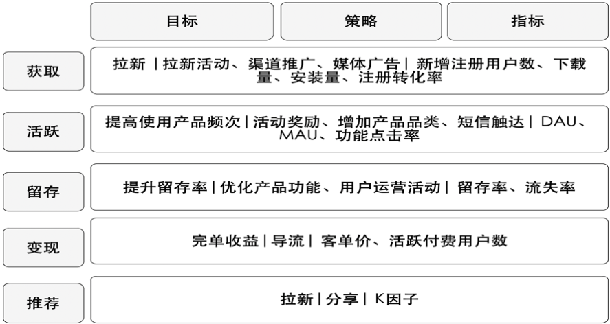 在《精益数据分析》一书中给出了两套比较常用的指标体系建设方法论,其中一个就是比较有名的海盗指标法,也就是我们经常听到的AARRR海盗模型。海盗模型是用户分析的经典模型,它反映了增长是系统性地贯穿于用户生命周期各个阶段的:用户拉新(Acquisition)、用户激活(Activation)、用户留存(Retention)、商业变现(Revenue)、用户推荐(Referral)。