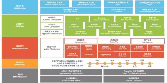 今天在海底捞超级App项目场景下,阿里巴巴进一步升级其数字化转型方案,开放了面向连接层的基础设施:移动研发平台EMAS。