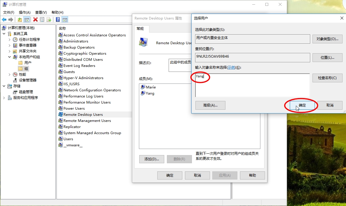 2、此电脑-->管理-->本地用户和组-->用户添加-->远程组选择用户