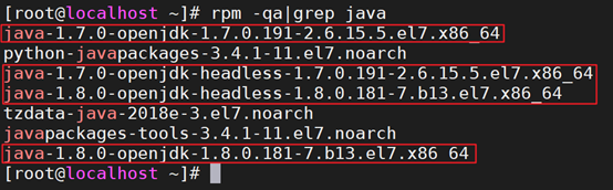 1.2 通过rpm包管理器命令卸载上图中框中的4个openjdk