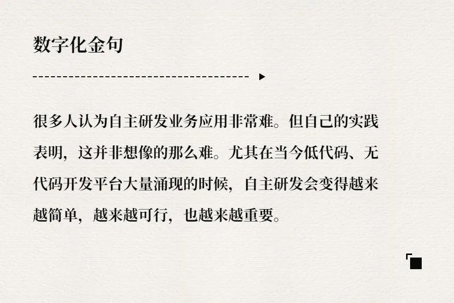 自主研发对团队的压力其实非常大,但他和整个团队对此非常自豪。一方面,这些系统都在集团各业务部门充分使用,客观上为集团创造了极大的生产和管理价值;另一方面,通过自主研发,自身的能力得到持续的、不断的提升,为未来塑造更多的可能打下了坚实基础。