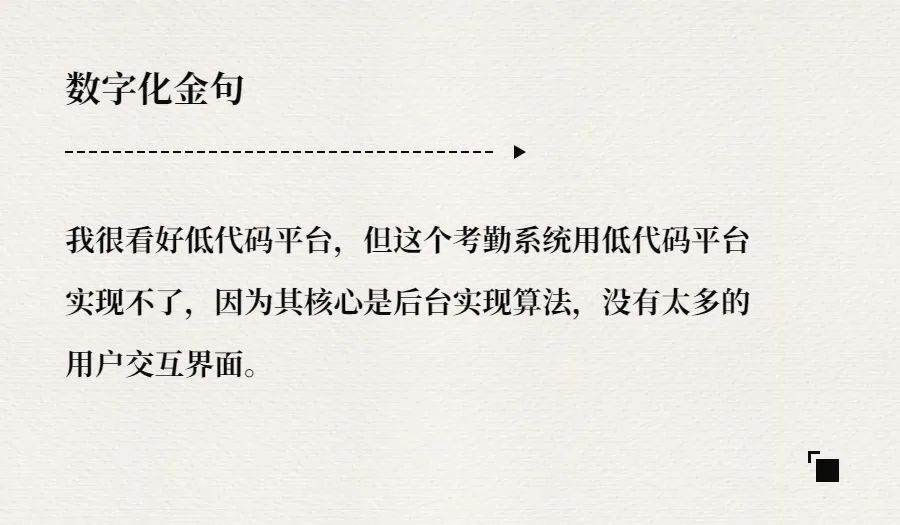 有限的时间内,要完成整个系统的开发工作并上线运行,实现整个集团的考勤数字化,专业的HR软件厂商都没办法保证能按时完成,完全自主开发更是难上加难。