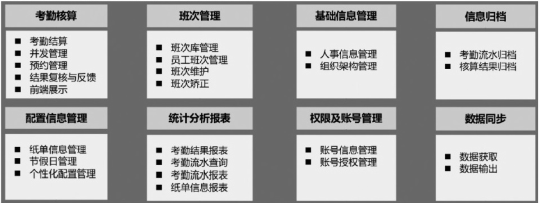 整个系统分为考勤核算、班次管理两大核心功能模块,还包括配置信息管理、基础信息管理、权限及账号管理、数据同步、信息归档、统计分析报表等功能。