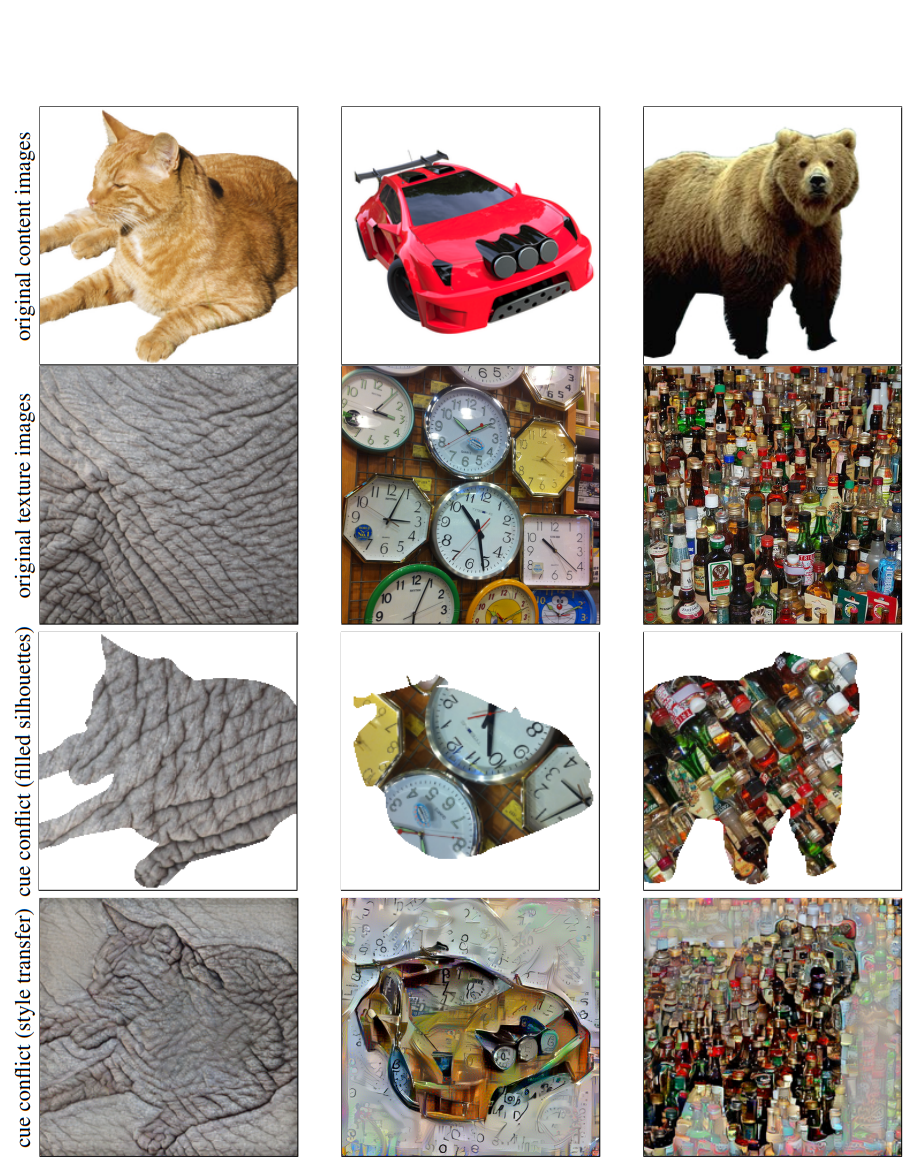 在生成的图像中,纹理不再提供主要的信息,因此物体的形状是剩下的唯一有用信息(其实也只是对人类而言,AI也可能会识别出一堆无法言说的别的未知特征)。