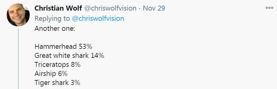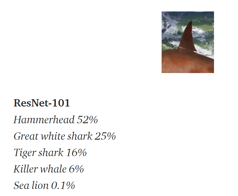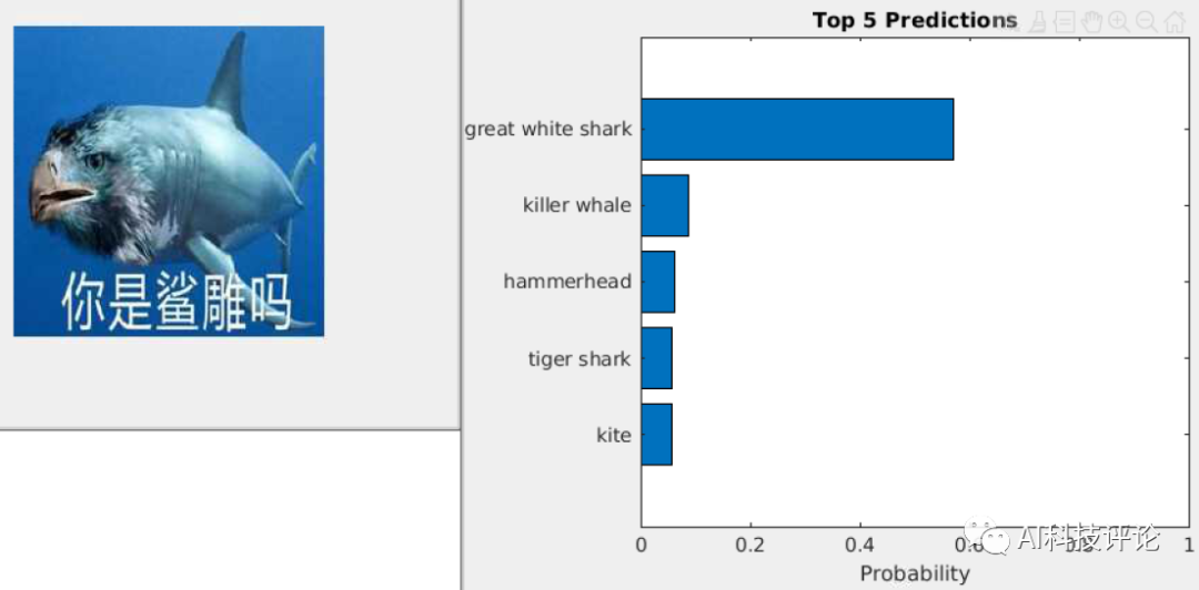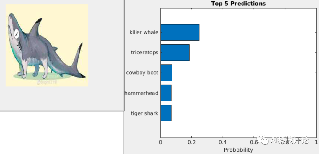 Christian Wolf同样用经过ResNet 101预训练的AI模型来识别它,Top5识别结果如下:双髻鲨:53%、大白鲨:14%、三角龙:8%、飞艇:6%、虎鲨:3%。