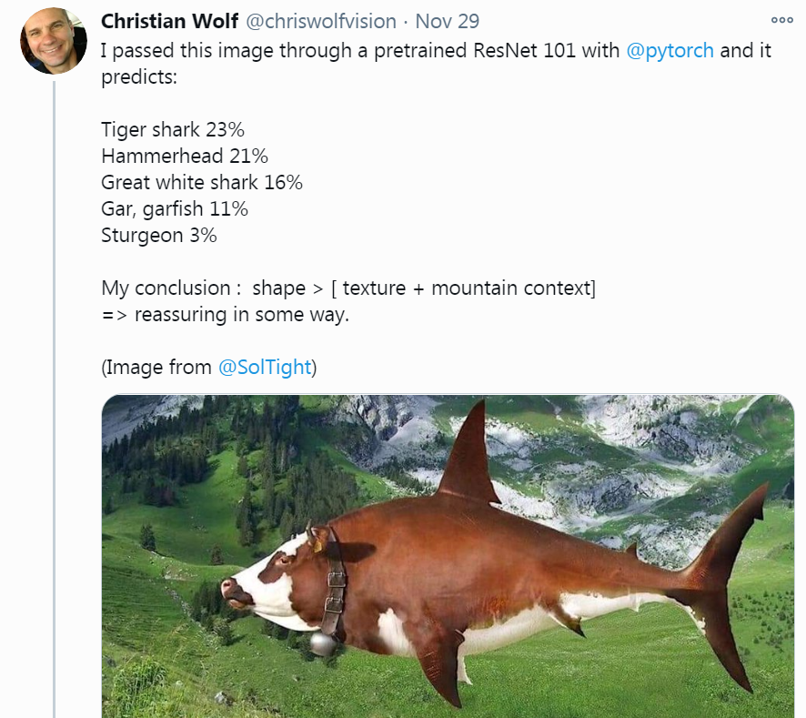 Christian Wolf说自己得到了一个结论:外形>[纹理+山脉的背景],意思就是说对AI识别而言,这张图的外形特征更突出,明显大于纹理的特征。