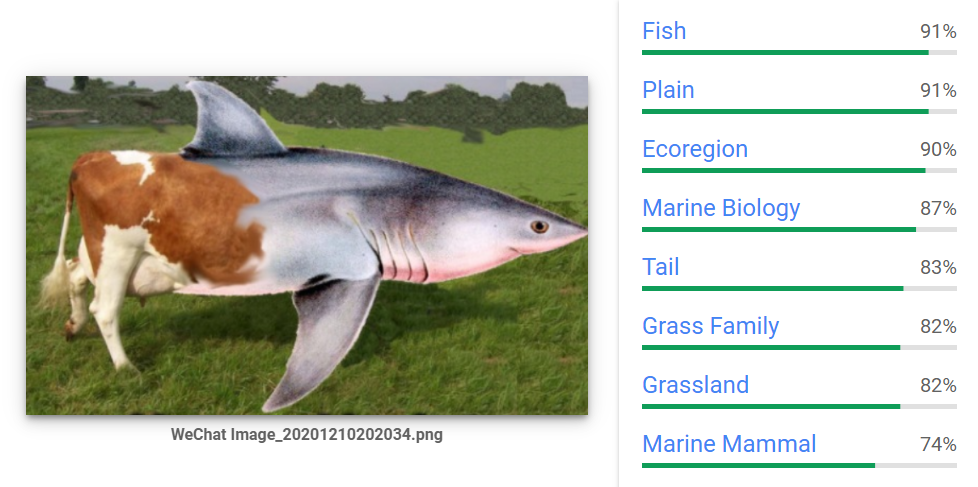 我输了我输了,我们上面玩的这么嗨,无一不是在打我的脸,显然是在说外形对AI识别来说真的非常重要,我认为牛鲨更像牛,但是对AI而言它明显优先识别的是鲨鱼的轮廓和它的鳍、尾巴等特征。