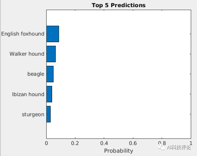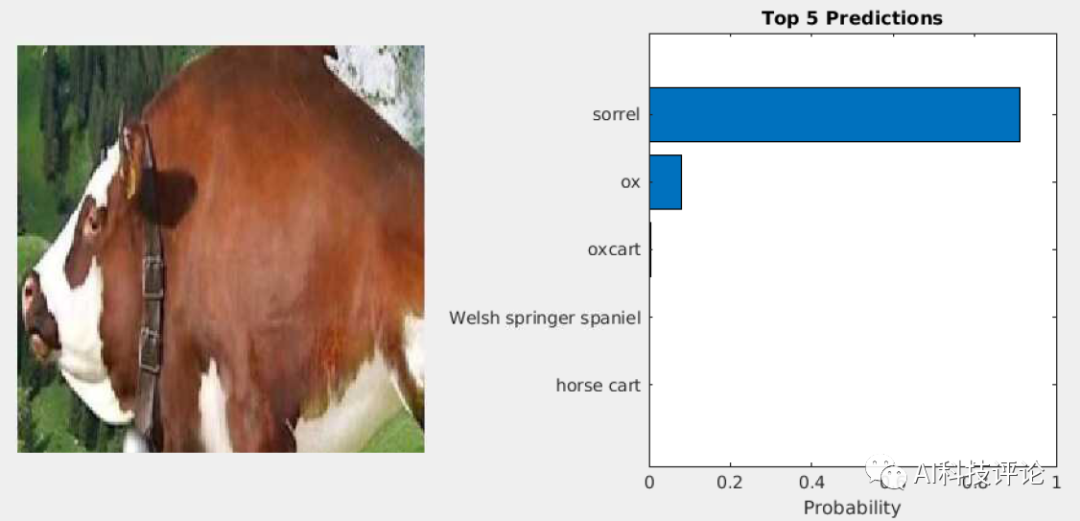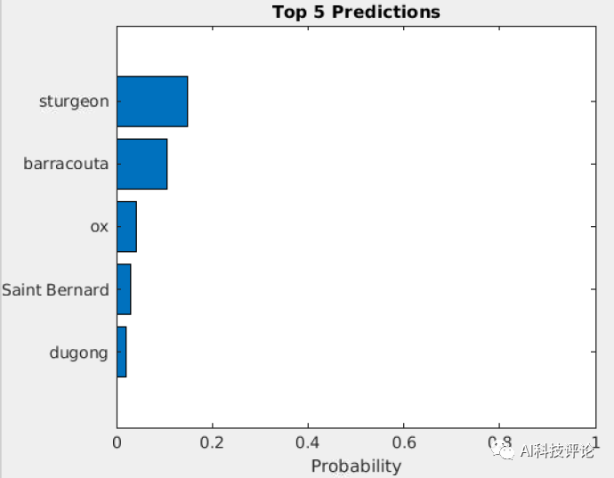 我接着往下看,发现有一位身在法国的奥地利AI研究科学家,一位老同志,名叫Christian Wolf,他闲来无事,把上面的这张不只是牛还是鲨的图片喂给了在pytorch上经过ImageNet数据集预训练的ResNet-101模型,结果AI识别Top 5结果显示如下: