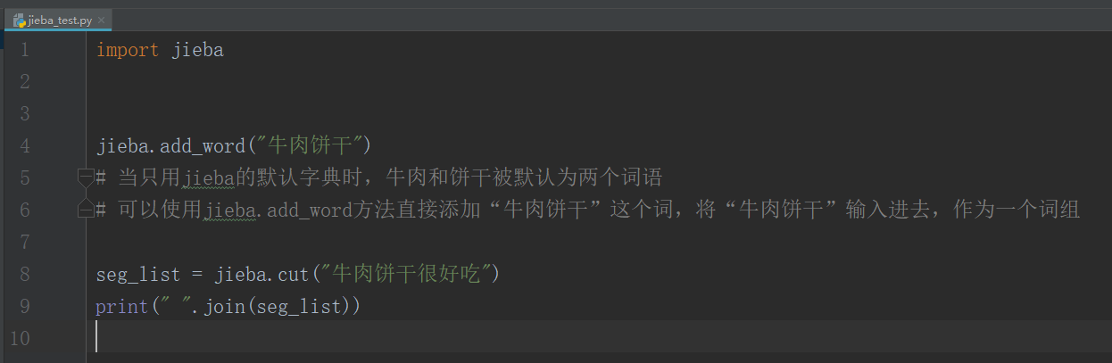 # 可以使用jieba.add_word方法直接添加“牛肉饼干”这个词,将“牛肉饼干”输入进去,作为一个词组