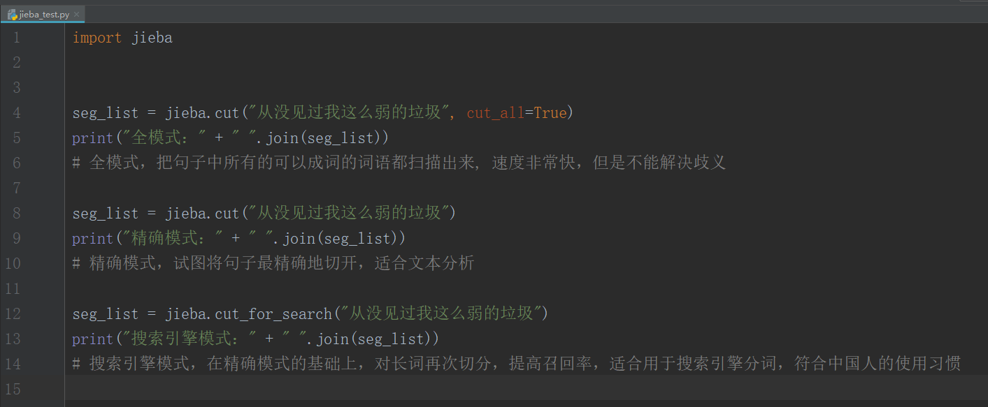 seg_list = jieba.cut("从没见过我这么弱的垃圾")