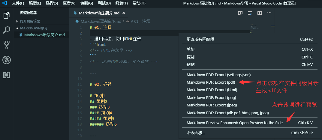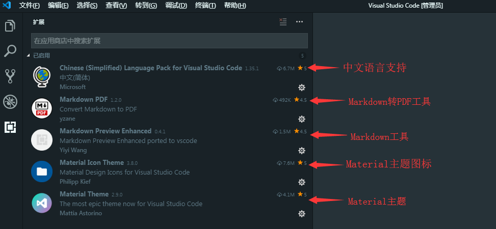 VSCode好用的插件很多,列了如下这几个,其中Markdown工具和Markdown转PDF工具是搭建Markdown书写环境所必需的。