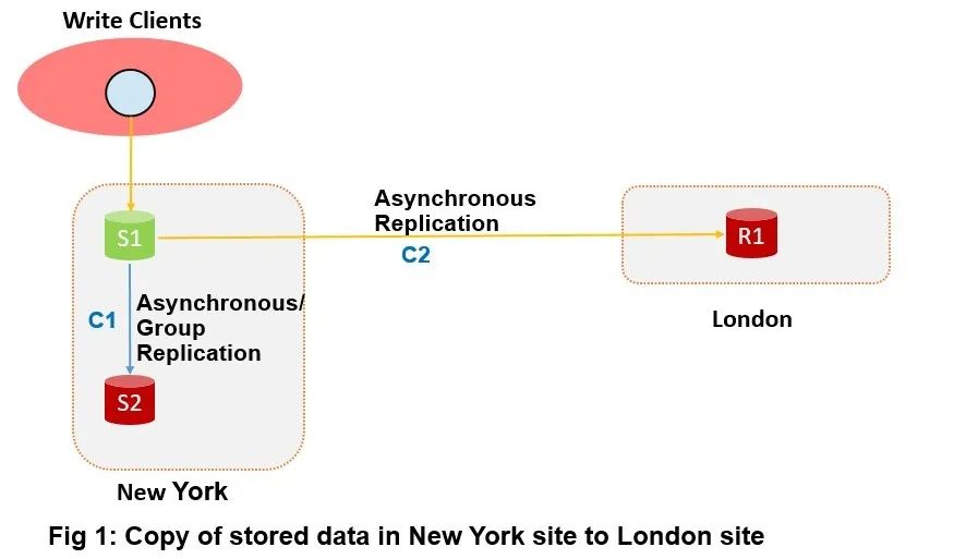 为了解释如何使用这个功能处理源服务器故障,让我们考虑以下情形:通过异步复制通道C2连接两个站点–纽约和伦敦,如下图1所示。纽约站点中的服务器(S1,S2)通过复制通道C1(用于自动故障转移的异步或组复制)连接,这意味着S2具有S1的数据副本。
