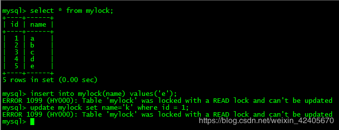 | 当前session中插入或者更新锁定的表都会提示错误: