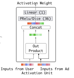 传统的Attention机制中,给定两个item embedding,比如u和v,通常是直接做点积uv或者uWv,其中W是一个|u|x|v|的权重矩阵,但这篇paper中阿里显然做了更进一步的改进,着重看上图右上角的activation unit,首先是把u和v以及u v的element wise差值向量合并起来作为输入,然后喂给全连接层,最后得出权重,这样的方法显然损失的信息更少。但如果你自己想方便的引入attention机制的话,不妨先从点积的方法做起尝试一下,因为这样连训练都不用训练。