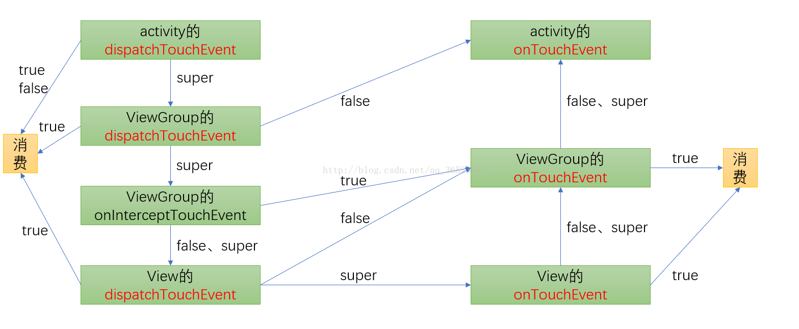 (1)activity的dispatchTouchEvent返回super传给下层,其他表示消费