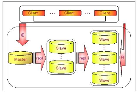 遇到这种情况如何解决呢?这时候我们就可以利用 MySQL 可以在 Slave 端记录复制所产生变更的 Binary Log 信息的功能,也就是打开 —log-slave-update 选项。然后,通过二级(或者是更多级别)复制来减少 Master 端因为复制所带来的压力。也就是说,我们首先通过少数几台 MySQL 从 Master 来进行复制,这几台机器我们姑且称之为第一级Slave 集群,然后其他的 Slave 再从第一级 Slave 集群来进行复制。从第一级 Slave 进行复制的 Slave,我称之为第二级 Slave 集群。如果有需要,我们可以继续往下增加更多层次的复制。这样,我们很容易就控制了每一台 MySQL 上面所附属 Slave 的数量。这种架构我称之为 Master - Slaves - Slaves 架构这种多层级联复制的架构,很容易就解决了 Master 端因为附属 Slave 太多而成为瓶颈的风险。下图展示了多层级联复制的 Replication 架构。
