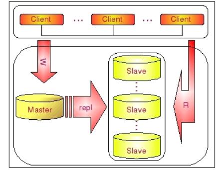 在实际应用场景中,MySQL 复制90% 以上都是一个Master 复制到一个或者多个Slave的架构模式,主要用于读压力比较大的应用的数据库端廉价扩展解决方案。因为只要Master 和 Slave 的压力不是太大(尤其是 Slave 端压力)的话,异步复制的延时一般都很少很少。尤其是自从Slave端的复制方式改成两个线程处理之后,更是减小了 Slave 端的延时问题。而带来的效益是,对于数据实时性要求不是特别 Critical 的应用,只需要通过廉价的pc server来扩展 Slave 的数量,将读压力分散到多台 Slave 的机器上面,即可通过分散单台数据库服务器的读压力来解决数据库端的读性能瓶颈,毕竟在大多数数据库应用系统中的读压力还是要比写压力大很多。这在很大程度上解决了目前很多中小型网站的数据库压力瓶颈问题,甚至有些大型网站也在使用类似方案解决数据库瓶颈。