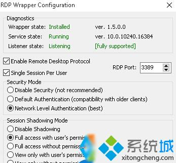 下载RDPWrap-v1.6小工具,然后解压,运行install.bat,然后运行RDPConfig.exe,看到Diagnostics后面都是绿色的,并且Listener state是Listening [fully supported]。