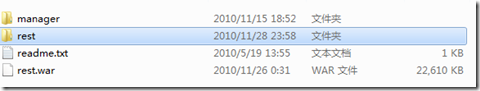 在重启Server服务后大约10秒后,在上一步存放rest.war文件的目录中,可以发现系统自动生成了一个名rest的文件夹,该文件夹的目录结构和rest.war中目录结构一致,也就是说在重启过程中,Tomcat自动将该war解压到同级目录中,如图6。