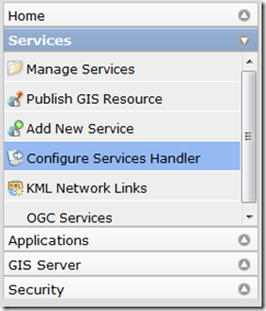 首先登录ArcGIS Manager,在其主页面左侧NavBar的Services选项卡中,选择标签“Configure Services Handler”(图2),