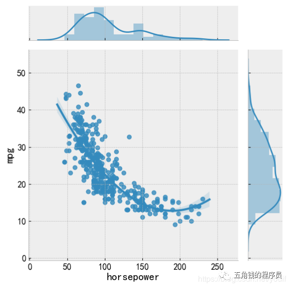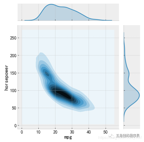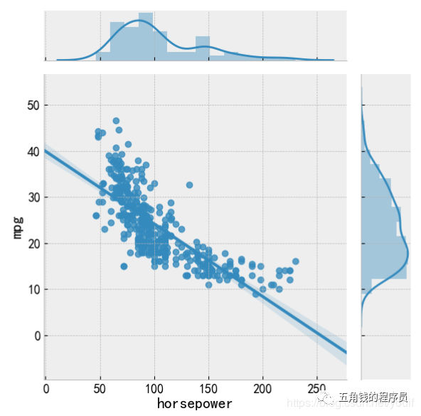 jointplot还是非常实用的, 对于两个连续型变量的分布情况, 集中趋势能非常简单的给出.