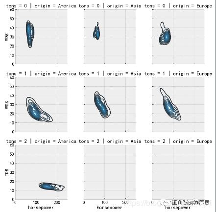 g.map(sns.kdeplot,"horsepower", "mpg")