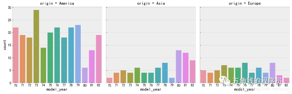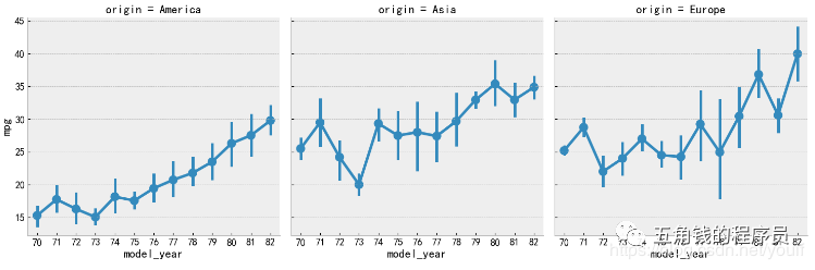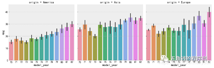 sns.factorplot(data=df, x="model_year", y="mpg", col="origin",kind='bar') #折线图转化为柱状图