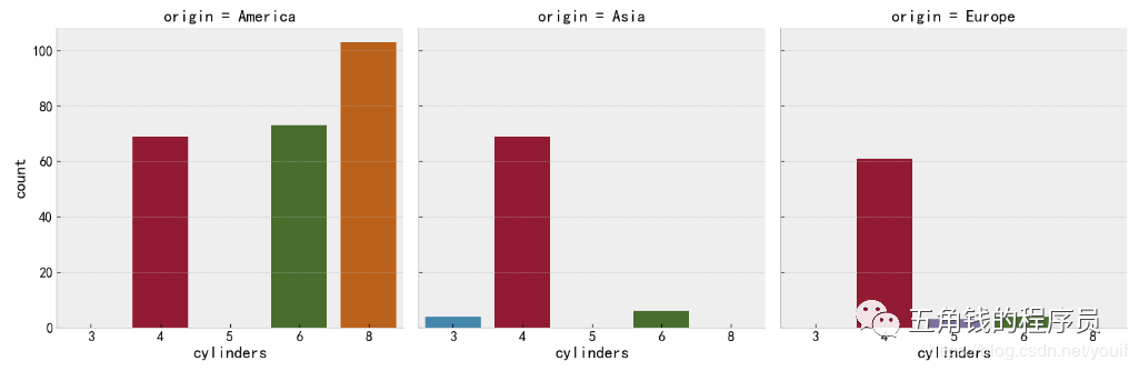 sns.factorplot("cylinders",data=df, col="origin",kind= 'count') #统计各个国家中cylinders的个数