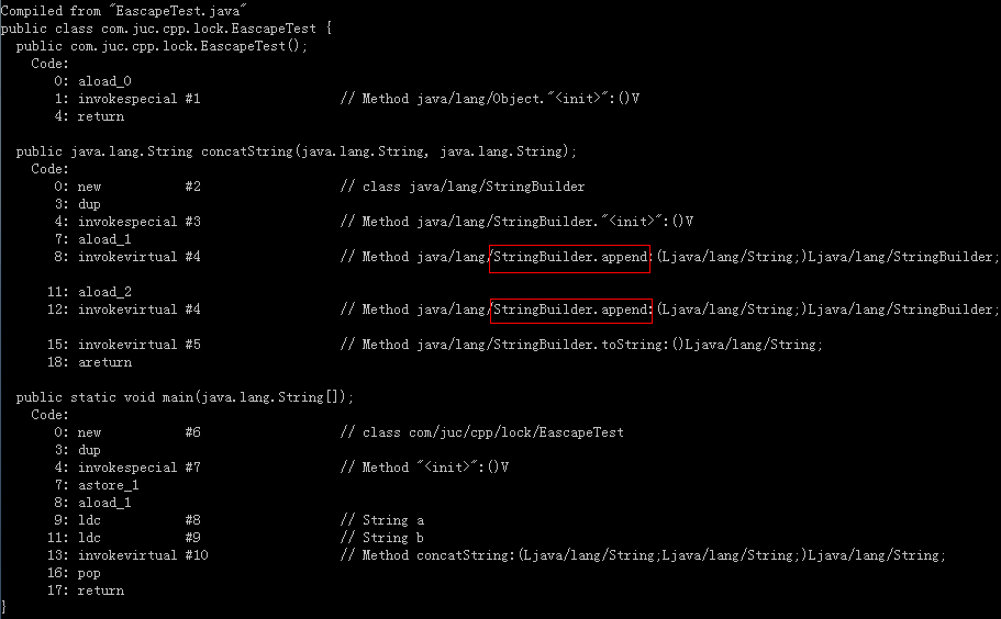 方法concatString,是我们在实际开发中经常会用到的一个字符串拼接的实现,从源代码层面上看是没有任何同步操作的。但实际JVM在运行这个方法时会优化为StringBuilder的append()操作,这个我们可以通过javap反编译来验证,见图二。