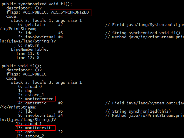 f1就是同步方法,f2就是同步代码块。这两种实现在背后有什么差异呢?我们可以先javac编译,然后再通过javap反编译来看下。