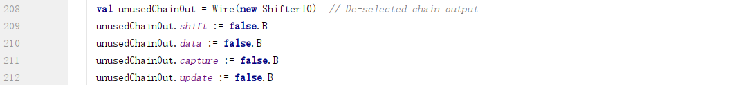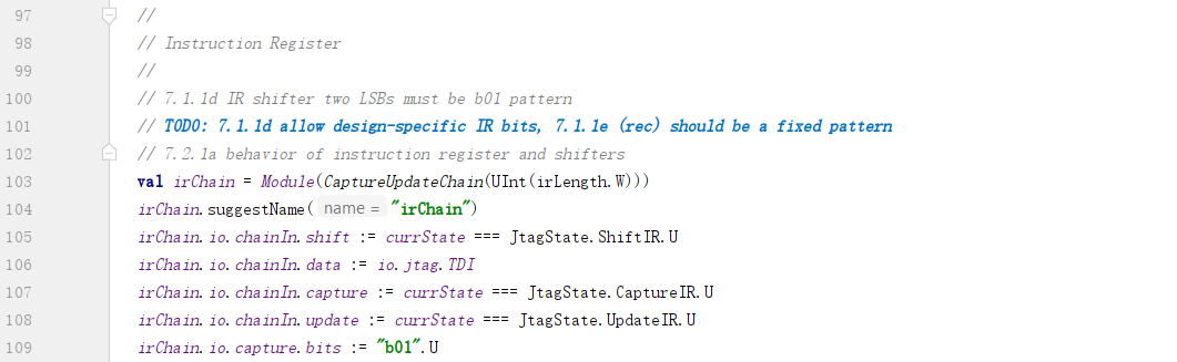 irChain是一个CaptureUpdateChain,可以并入并出。并且irChain的io.chainIn与io.chainOut中间以移位寄存器链相连接。