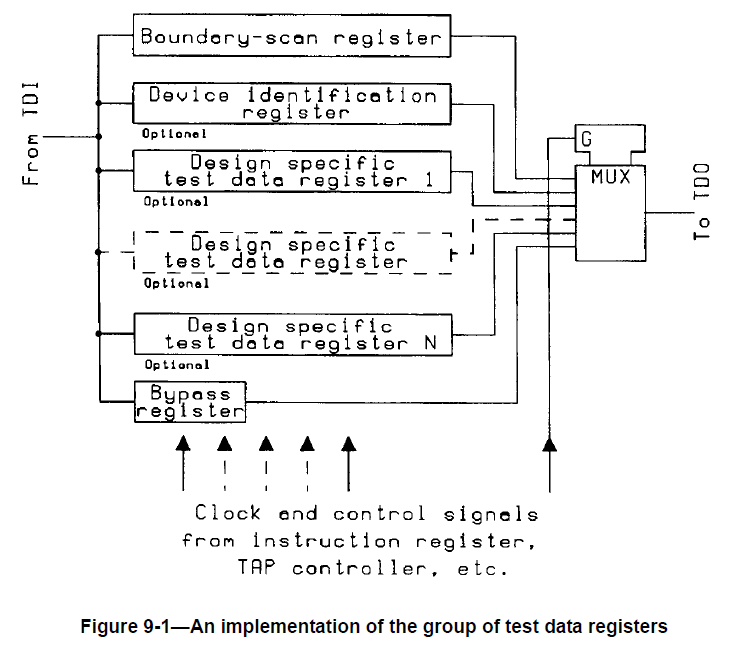 而数据寄存器(DR)则包括很多,TAP控制器需要根据指令的不同,把不同的数据寄存器连接到TDI和TDO之间。