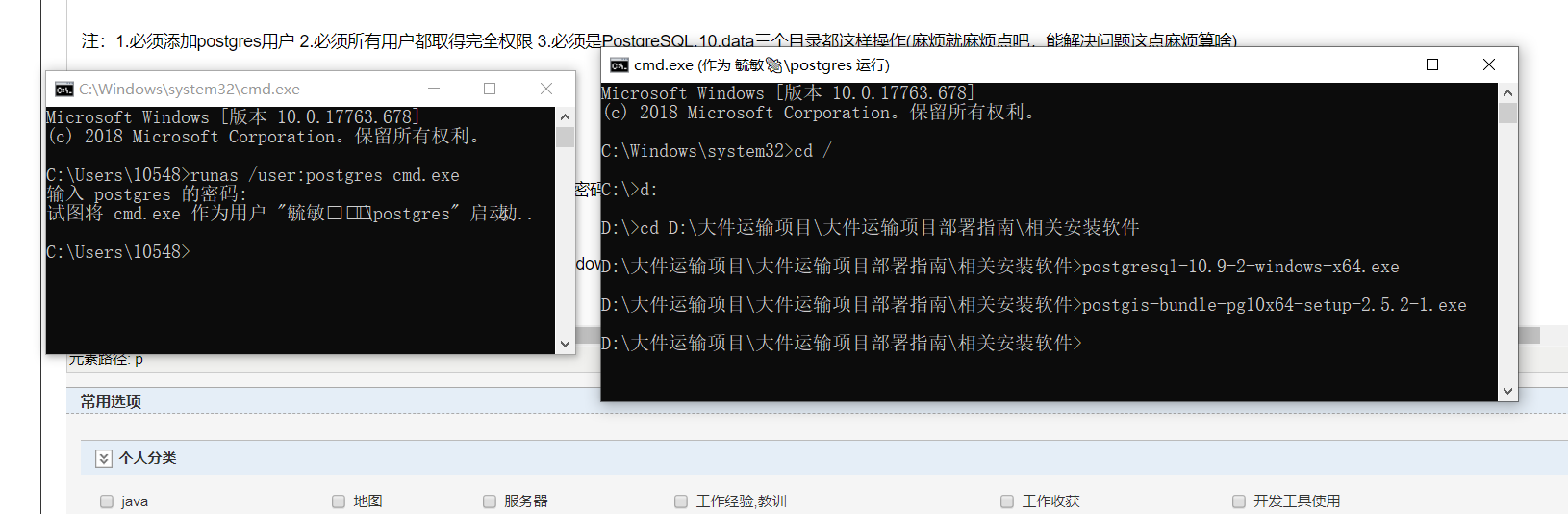 one.用postgres用户运行cmd runas /user:postgres cmd.exe