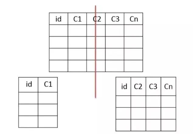 简单来说垂直拆分是指数据表列的拆分,把一张列比较多的表拆分为多张表。如下图所示,这样来说大家应该就更容易理解了。