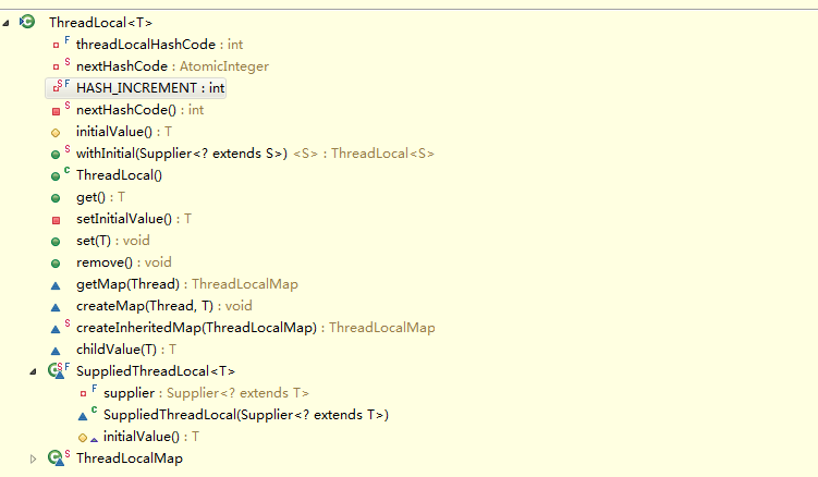 ThreadLocalMemoryLeak 通过ThreadLocal<Counter> counterHolder 来实现每个线程有各自的对象Counter,那么是只能用来实现每个线程都有自己Counter呢 ?先看看ThreaLocal的源码 ,ThreadLocal的内部成员结构: